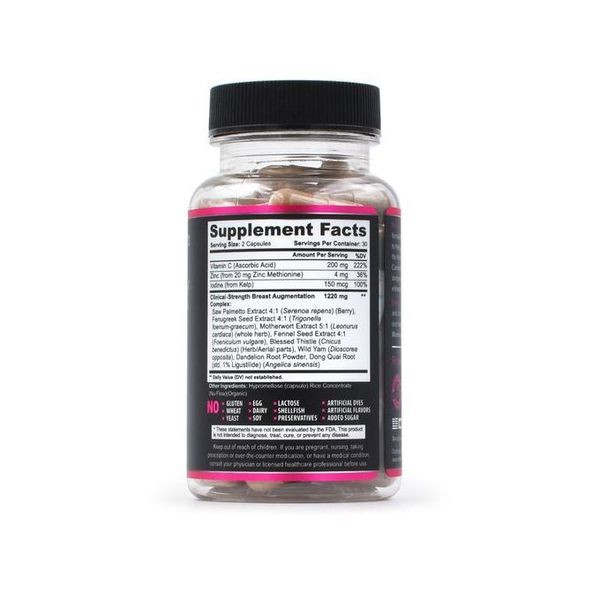 Ingrédients: poudre de graines de fenugrec, poudre de baies de palmier nain, poudre de graines de fenouil, poudre de racines d'igname, poudre de racines de Pueraria Mirifica, poudre de racines de pissenlit, poudre de varech, poudre de racines de Dong Quai, L-tyrosine, hypromellose (capsule), farine de riz, magnésium stéarate.